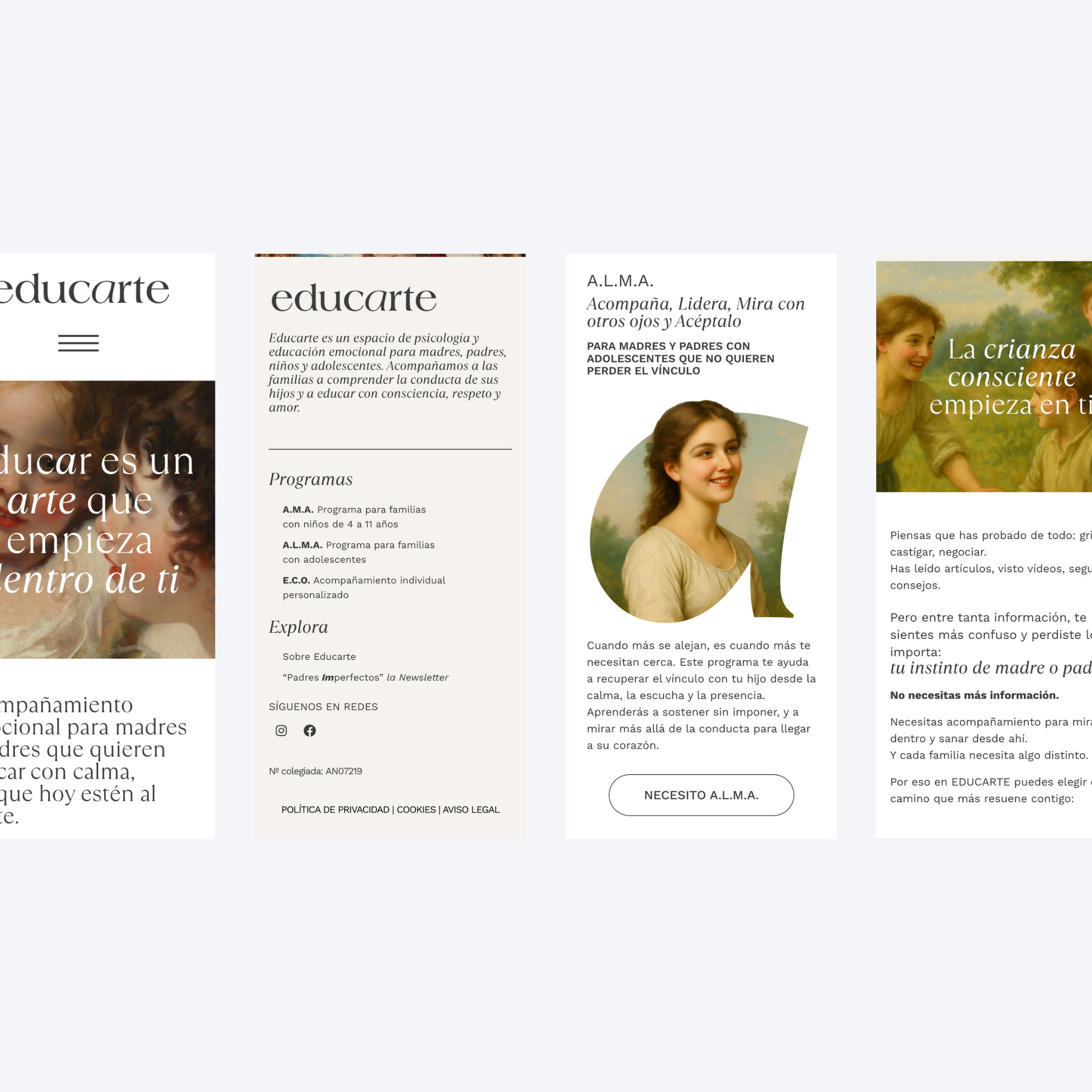 Mi trabajo incluyó la maquetación completa, la adaptación a distintos dispositivos, la configuración técnica necesaria para su correcto funcionamiento y la integración de elementos específicos solicitados por la marca. La combinación entre el diseño de Marta y la implementación web permitió a Centro EducArte obtener una plataforma sólida, elegante y perfectamente alineada con su esencia.